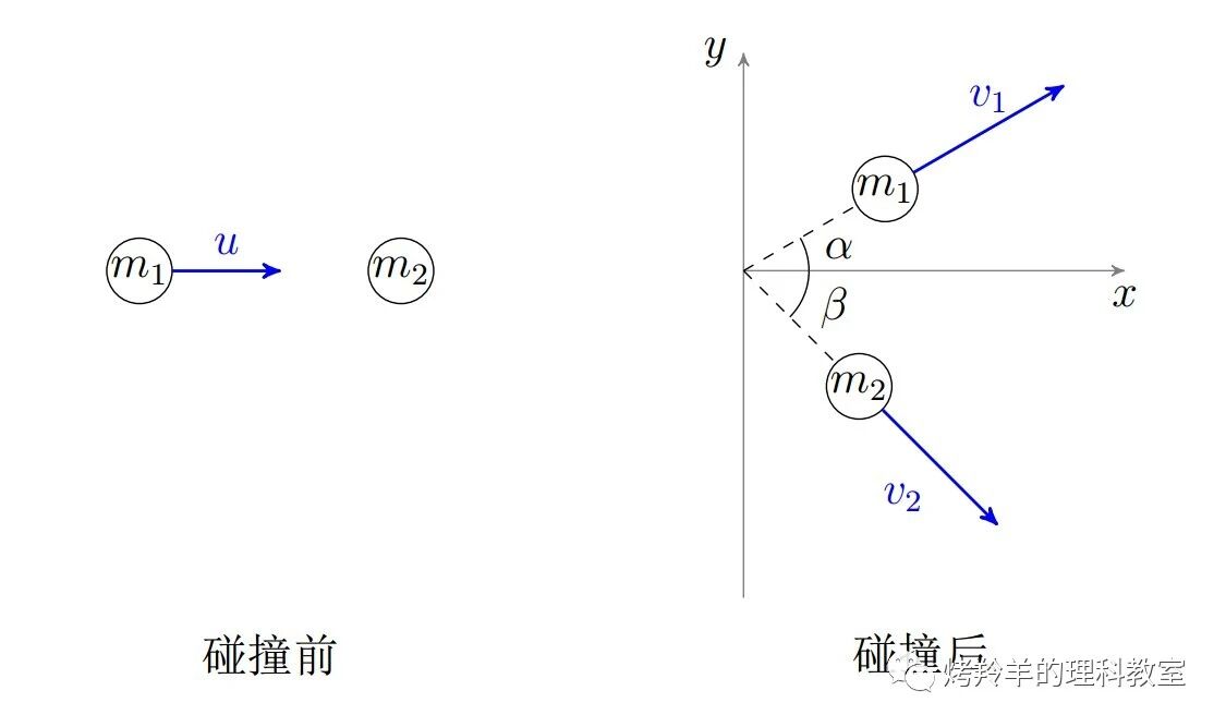 设两个物体的质量分别为 \(m_1\) 和 \(m_2\)。为了讨论方便起见,我们假定,\(m_1\) 沿 \(x\)-轴方向以初速度 \(u\) 朝着处于静止状态的 \(m_2\) 杀将过来。碰撞后,\(m_1\) 和 \(m_2\) 分别以速度 \(v_1\) 和 \(v_2\) 各作鸟兽散,其中 \(v_1\) 和 \(v_2\) 与 \(x\)-轴方向所成的角度分别为 \(\alpha\) 和 \(\beta\)(如图所示)。