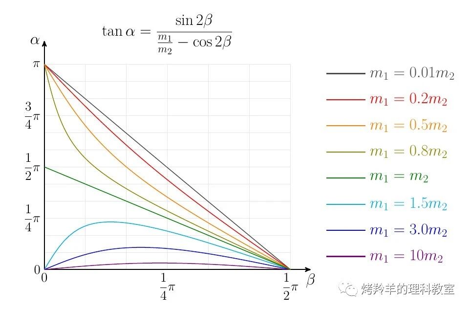 此时 \(\frac{m_1}{m_2} - \cos2\beta\) 可正可负,\(\tan \alpha\) 可以取到任意值,因此 \(\alpha\) 的偏转角度可能取到 \(0\) 至 \(\pi\) 之间的任意角度。
