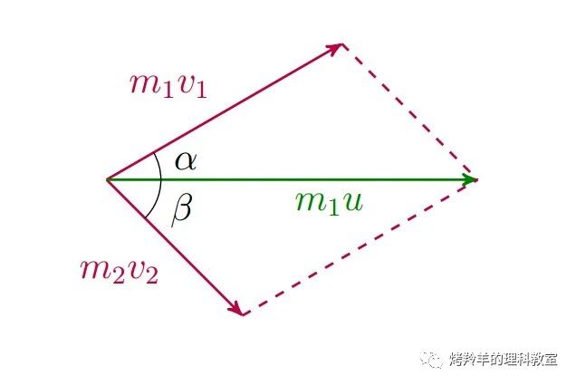 \[\begin{aligned} m_1 u = m_1 v_1 \cos\alpha + m_2 v_2 \cos\beta & \quad (1) \\ 0 = m_1 v_1 \sin\alpha - m_2 v_2 \sin\beta & \quad (2) \\ \end{aligned}\]我们可以从这两条方程先解出 \(v_1\) 和 \(v_2\) 初步的关系式。我们当然可以硬来,不过这里将动量守恒用矢量三角形的方式表示出来,求解 \(v_1\) 和 \(v_2\) 会容易得多。