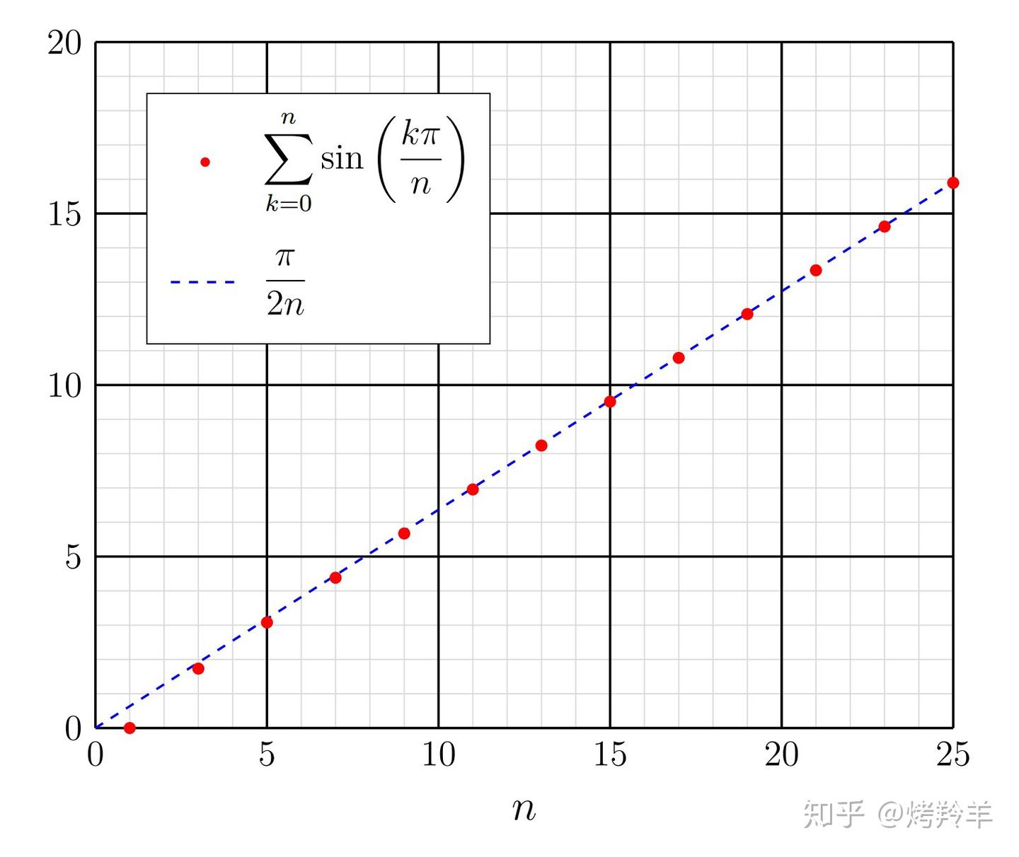 \[\sum_{k=0}^n \sin \left( \frac{k\pi}{n} \right) \approx \frac{1}{\frac{\pi}{2n}} = \frac{\pi}{2n}\]我用作图软件画出了相应的图像,可以看出这个近似的精度还是相当高的。