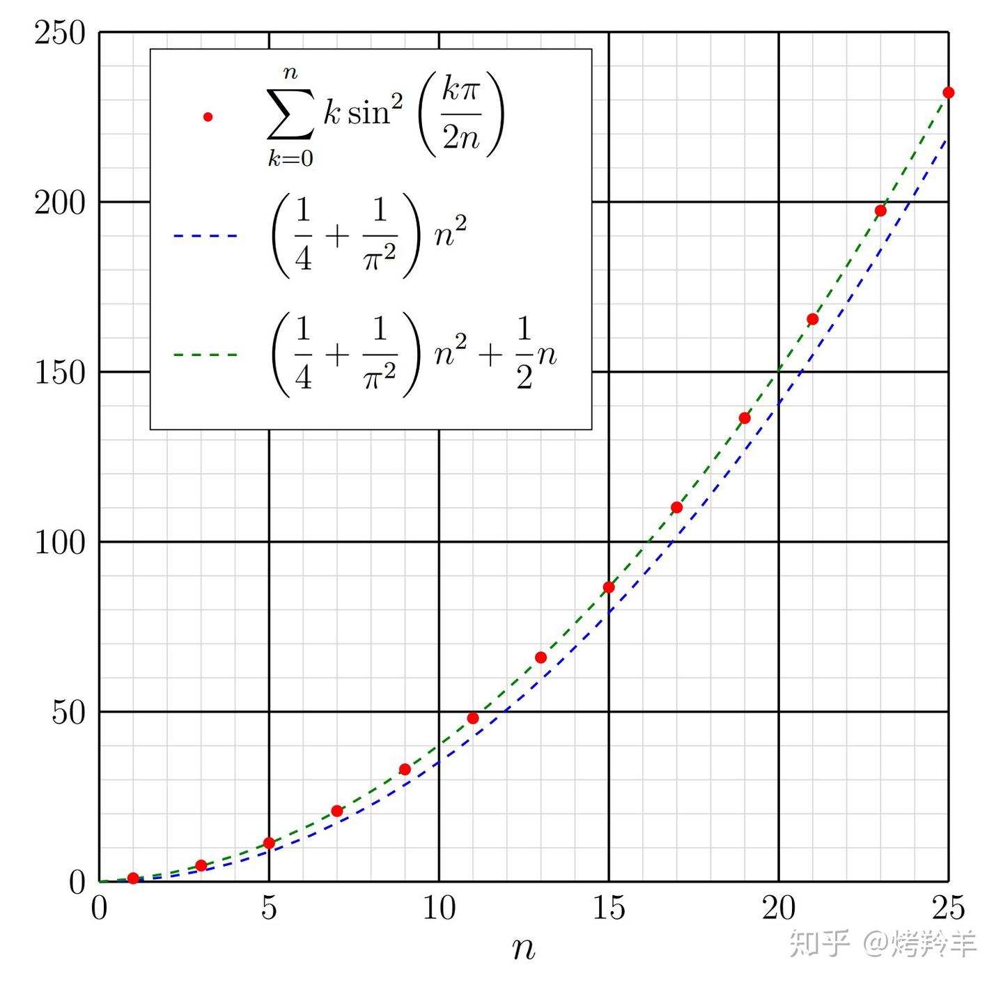 \[\sum_{k=0}^n k \sin^2 \left( \frac{k\pi}{2n} \right) \approx \left( \frac{1}{4} + \frac{1}{\pi^2} \right)n^2 + \frac{1}{2}n\]在上图中,可以看到,这个近似的精度就相当之高了。一堆正弦函数的级数和,居然可以近似成一个二次函数,乍看起来还是挺神奇的吧!