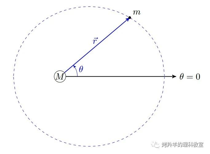 由于引力取决于两个星体之间的距离 \(r\),直角坐标系中具体写出来的 \(r=\sqrt{x^2+y^2}\) 会把 \(x\)、\(y\) 坐标搅在一起,分离变量再分别求解的套路将变得非常困难。相比较而言,选择极坐标会便是更好的切入点。