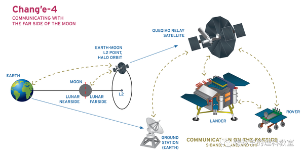 地月系统中的 \(L_2\) 点,也被我们中国的探月工程开发利用。2018年随嫦娥四号发射的登月探测器——玉兔二号——成功在月球背面着陆。这是全世界范围内成功在月球背面实现成功软着陆的首例。玉兔二号在月背与地球的中继通信,就是靠着同年发射的鹊桥号——一颗位于地月系统 \(L_2\) 轨道处的中继卫星——来实现的。