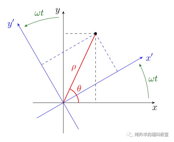 \[\left\{\begin{array}{ccl} x &=& x'\cos\omega t - y' \sin\omega t \\ y &=& x'\sin\omega t + y' \cos\omega t \\ z &=& z' \end{array}\right. \qquad(7')\]接着强行一通操作