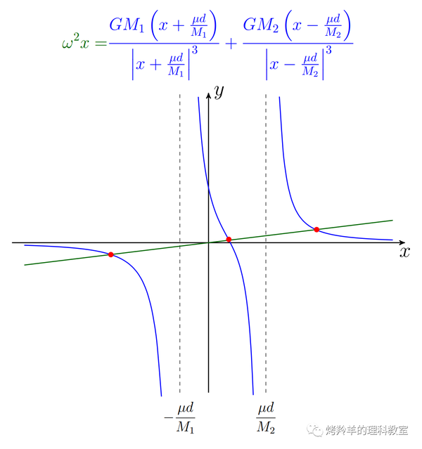 \[\begin{aligned} m\omega^2 x &= \frac{\partial V}{\partial x} = \frac{GM_1m\left(x+\frac{\mu d}{M_1}\right)}{\left[ \left( x+\frac{\mu d}{M_1} \right)^2 + y^2\right]^\frac{3}{2}} + \frac{GM_2m\left(x-\frac{\mu d}{M_2}\right)}{\left[ \left( x-\frac{\mu d}{M_2} \right)^2 + y^2\right]^\frac{3}{2}} & \quad(11a)\\ m\omega^2 y &= \frac{\partial V}{\partial y} = \frac{GM_1my}{\left[ \left( x+\frac{\mu d}{M_1} \right)^2 + y^2\right]^\frac{3}{2}} + \frac{GM_2my}{\left[ \left( x-\frac{\mu d}{M_2} \right)^2 + y^2 \right]^\frac{3}{2}} & \quad(11b) \end{aligned}\]要对这组方程下手,比较明智的突破口显然是 \((11b)\)。一个显而易见的解是 \(y=0\),即小星体位于两个大哥的连线或延长线上。如此一来,\((11a)\) 就退化成一个只关于 \(x\) 的方程: