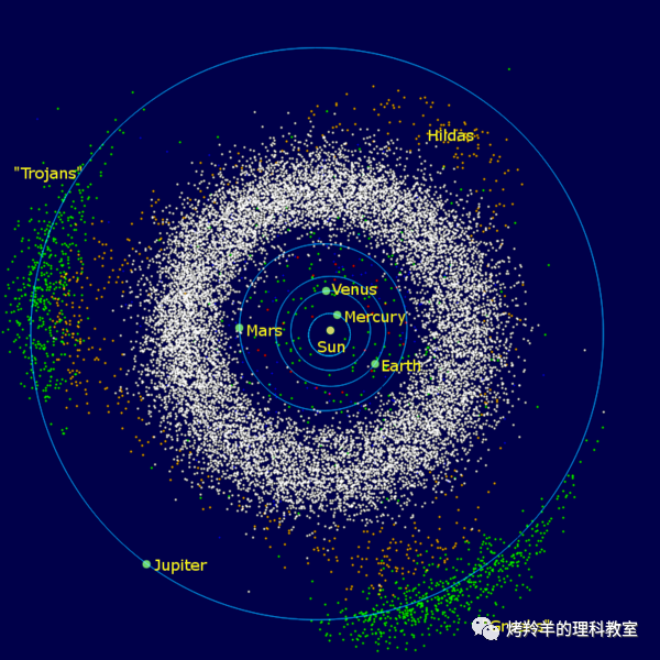 在太阳系中,太阳和木星的质量差近1000倍,远在25倍以上,日木系统的 \(L_4\) 和 \(L_5\) 就成为了天然的稳定平衡点,成为了一大堆小行星的快乐家园。据统计,日木系统中有几千枚这样的小行星,分别聚团在 \(L_4\) 和 \(L_5\) 处,一波运行在木星前方,一波运行在木星后方,它们被称为特洛伊小行星(trojan),如同木星手下的一帮贴身护卫,步调一致,不会随便走散。此外,太阳与其他行星形成的系统中,也陆续发现有很多特洛伊小行星。火星、土星、海王星的身边,都存在数量不等的特洛伊小行星们。