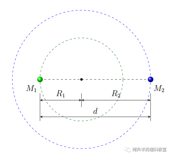 注意到 \(d=R_1+R_2\) 以及质心参考系中 \(M_1 R_1 = M_2 R_2\),我们很容易计算得到 \(M_1\) 和 \(M_2\) 的圆周轨道半径分别为
