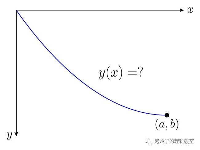 为方便起见,我们将坐标系的 \(y\)-轴搞成朝下的方向,斜向下的轨道可以由函数 \(y(x)\) 给出,其中轨道的起点和终点分别设为 \((0,0)\) 和 \((a,b)\),我们来试求最速降曲线的函数式。