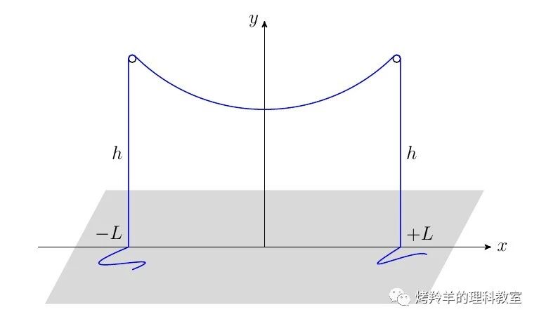 我们在此考虑一个稍有不同的问题。假设有等高的两个支点,它们的坐标为\((L, h)\) 和 \((-L,h)\)。软绳搭在这两个支点上,一部分悬在两个支点之间,多出来的部分自由下垂耷拉到地面上(如图所示)。