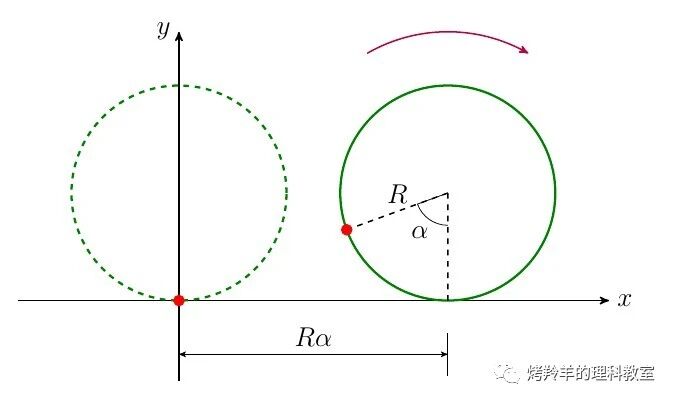 \[\begin{aligned} \frac{\mathrm{d}y}{\mathrm{d}x} = \frac{\frac{\mathrm{d}y}{\mathrm{d}\alpha}}{\frac{\mathrm{d}x}{\mathrm{d}\alpha}} = \frac{\sin\alpha}{1-\cos\alpha} = \frac{\sqrt{1-\cos^2\alpha}}{1-\cos\alpha} = \sqrt{\frac{1+\cos\alpha}{1-\cos\alpha}} \\ \sqrt{ \frac{k-y}{y} } = \sqrt{ \frac{k - \frac{1}{2}k(1-\cos\alpha)}{\frac{1}{2}k(1-\cos\alpha)}} = \sqrt{\frac{1+\cos\alpha}{1-\cos\alpha}} \end{aligned}\]这验证了(22)式的参数方程确实是(17)式的解。而参数方程可以更明确地表达出摆线的几何意义(如图)。当圆向前滚动转过 \(\alpha\) 角,圆心的位置会向前推进 \(R\alpha\) 的距离,圆周上定点相对圆心的位置也会有相应的转动,这两方面因素综合起来就可以给出定点的坐标(22)式。