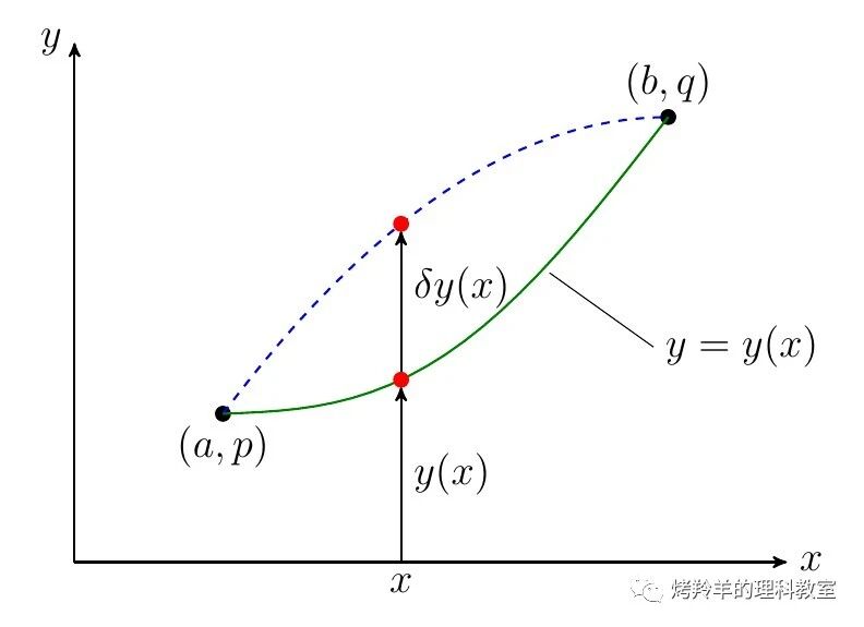 假设我们有两个定点 \((a,p)\) 和 \((b,q)\),连接这两点的任意曲线的方程 \(y = y(x)\) 都将满足如下的边界条件: