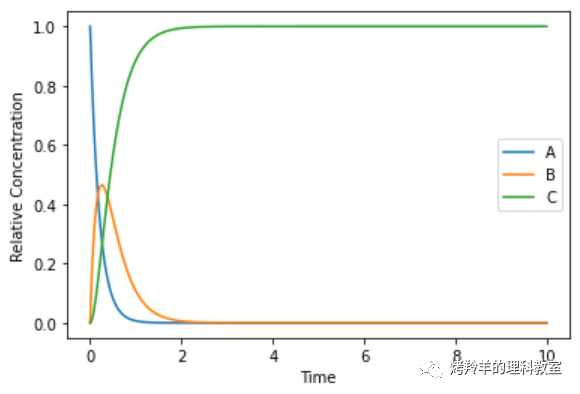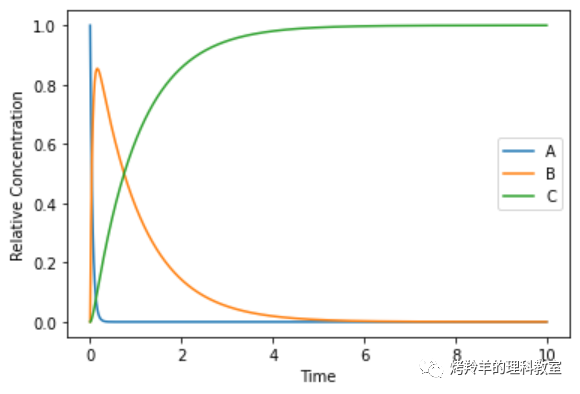 \[A \stackrel{k_1}{\longrightarrow} B \stackrel{k_2}{\longrightarrow} C\]其中 \(k_1\) 和 \(k_2\) 分别是各阶段反应的速率常数。如果每个阶段涉及到的都是一级反应(first-order reaction),我们就可以写出 \(A\), \(B\), \(C\) 三者浓度(concentration)随时间变化的微分方程。