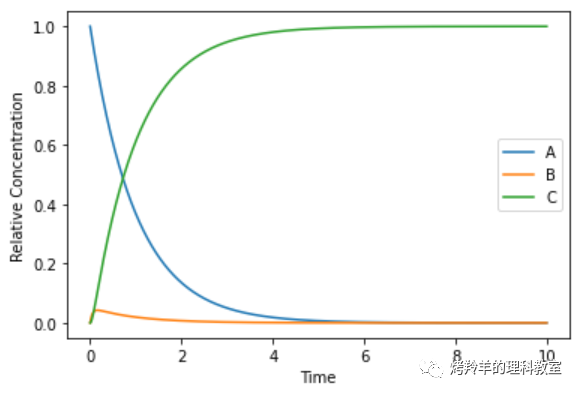 如果 \(A\) 到 \(B\) 的反应远远快于 \(B\) 到 \(C\) 的反应,那可以预计 \(A\) 的浓度会被立刻抽干,但因为后续反应很磨叽,整个反应会卡在中间产物 \(B\) 这环,所以会看到 \(B\) 的浓度近乎直接拉满,近似就等于 \(A\) 的初始浓度,然后慢慢地开始随时间呈指数下降。而最终产物 \(C\) 的浓度也由此随时间缓缓地上升。