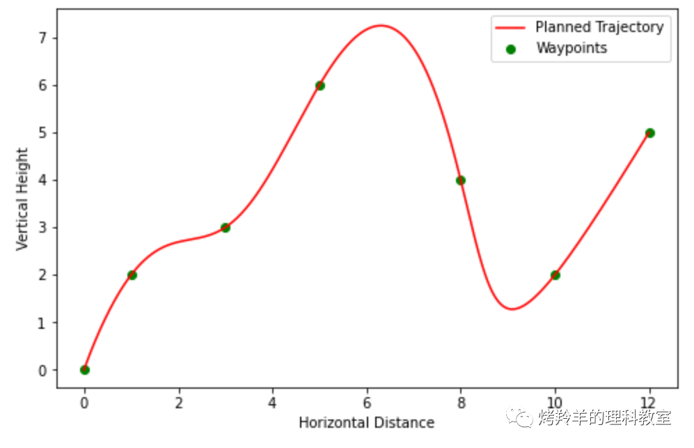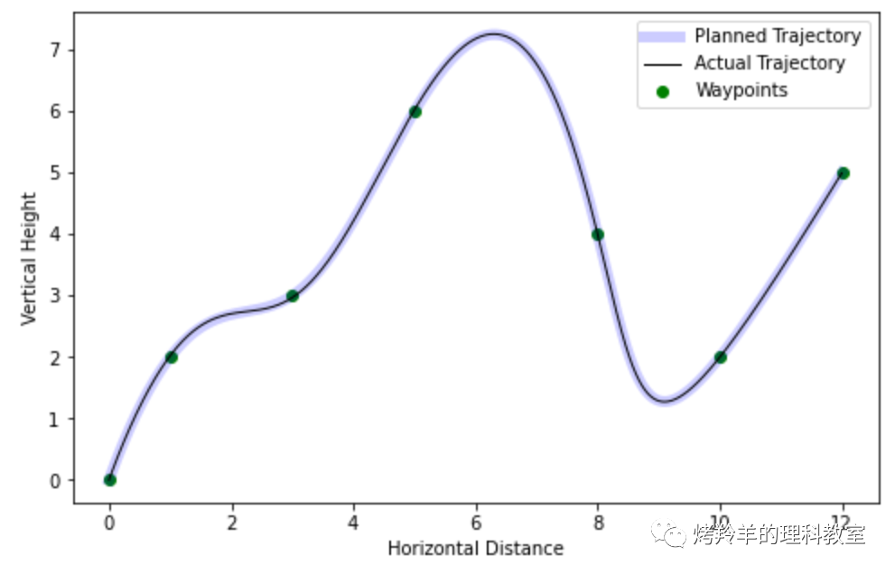 我将运动限制在 \(y\)-\(z\) 平面内,设定了一些航点,然后建立好待解方程组的系数矩阵后,最后调用 Python + numpy 下面的线性代数模块,计算出了所有分段函数的多项式系数。