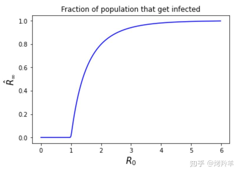 \[1 - \hat{R}_\infty - \mathrm{e}^{-\mathcal{R}_0 R_\infty} = 0\]对于特定的 \(\mathcal{R}_0\) 值,我们可以用程序找出 \(\hat{R}_\infty\) 的数值解,结果如图所示: