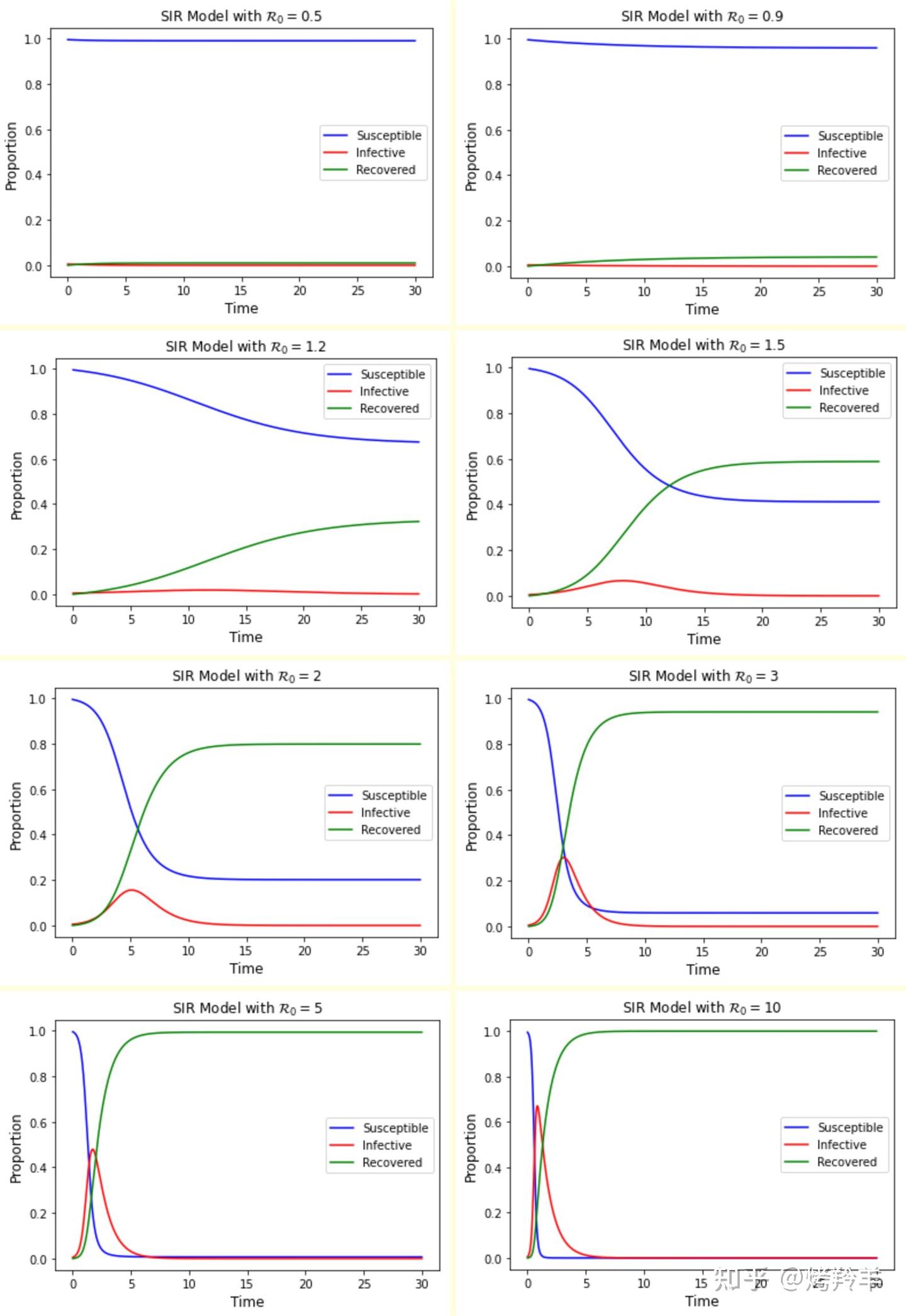 下面是我作的几组不同 \(\mathcal{R}_0\) 取值下的 SIR 模拟。