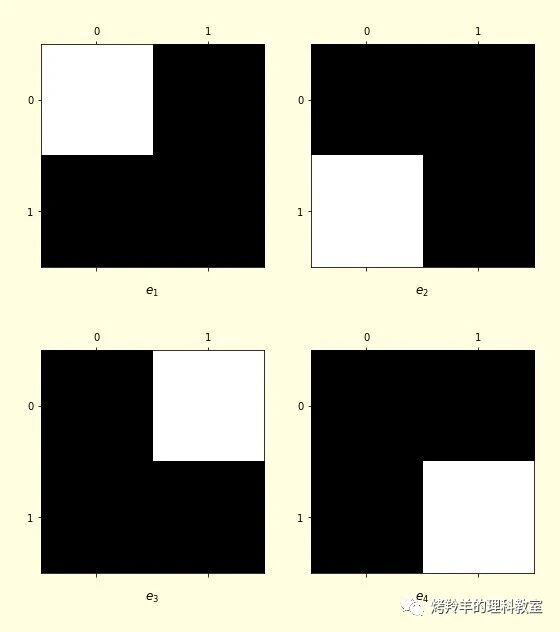 \[e_1 = \begin{bmatrix} 1 & 0 \\ 0 & 0 \end{bmatrix},\; e_2 = \begin{bmatrix} 0 & 0 \\ 1 & 0 \end{bmatrix},\; e_3 = \begin{bmatrix} 0 & 1 \\ 0 & 0 \end{bmatrix},\; e_4 = \begin{bmatrix} 0 & 0 \\ 0 & 1 \end{bmatrix}\]它们可以图形化地表示为: