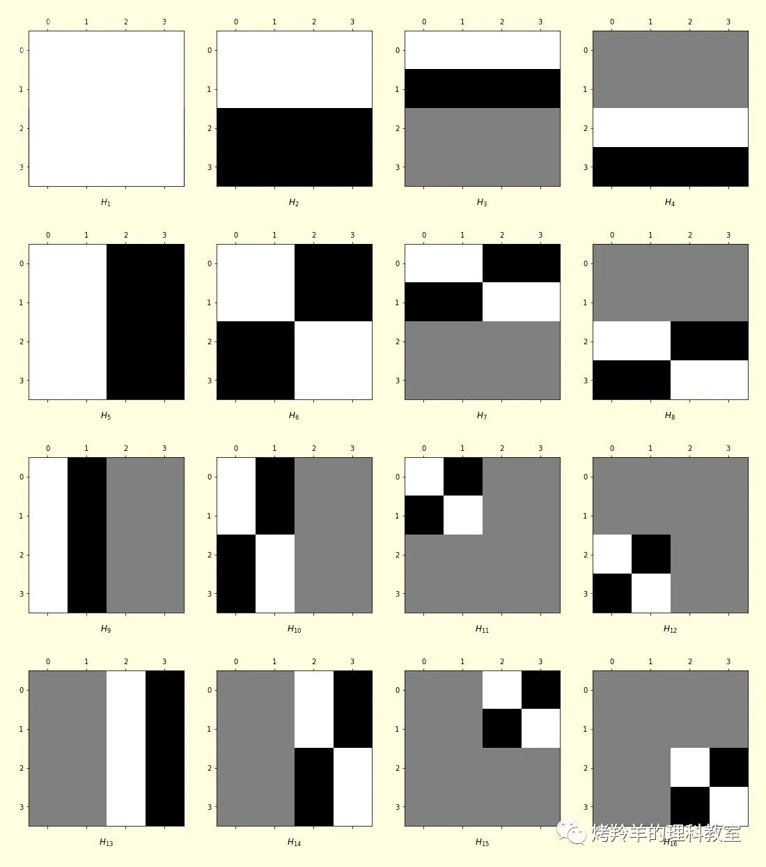 即便对于我们要处理的 \(128\times128\) 像素的那张渣画质图片,要把这里的矩阵全部写出来也太可怕了。让我们来看一下这 \(4\times4\) 的矩阵空间里,对应的 \(16\) 个 Haar 矩阵长什么样。直接码矩阵依然很可怕,我们这里只是把图形化的表示贴出来: