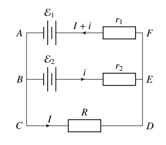 我们假想在它们两端接上一个电阻为 \(R\) 的用电器。不失普遍性,假设 \(\mathcal{E}_1>\mathcal{E}_2\),各支路上的电流如图所示。