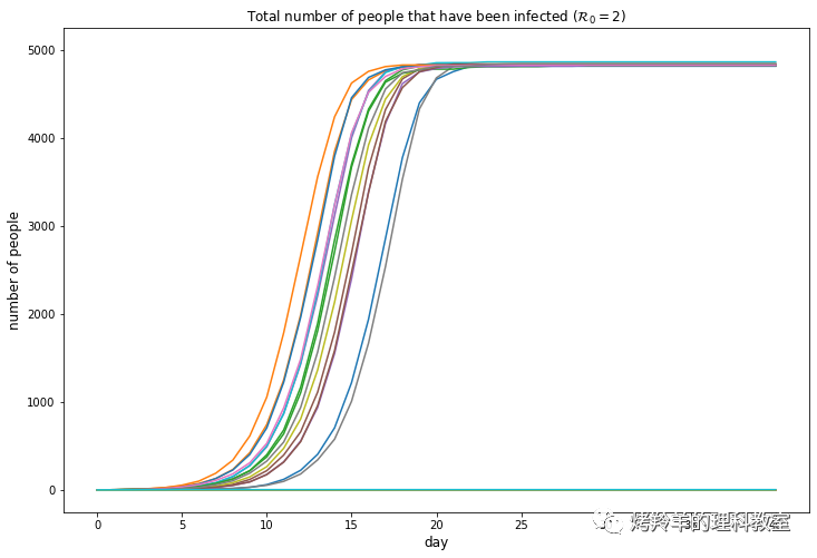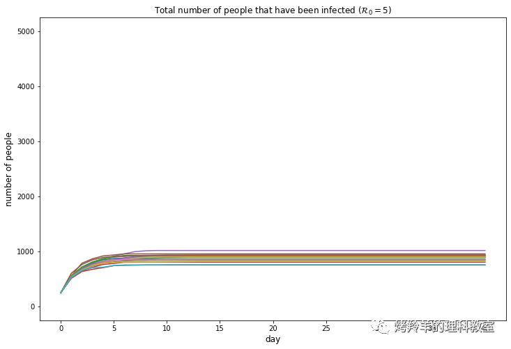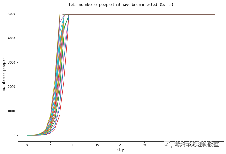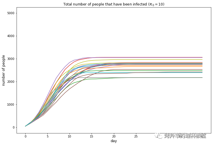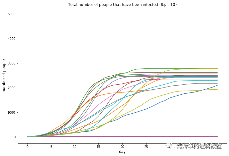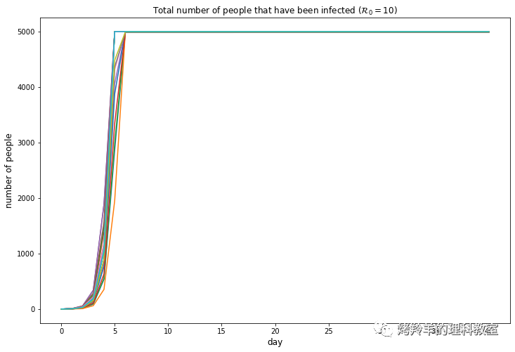 到了 $\mathcal{R_0} = 5$,这病毒的传播力已经很可怕了。没有管控,这病毒不再跟你讲运气啥的,后果基本就是一周时间内病毒扩散传播至全部的人。$\mathcal{R_0} = 10$ 甚至可以稳定在5天左右的时间内影响至所有人。
