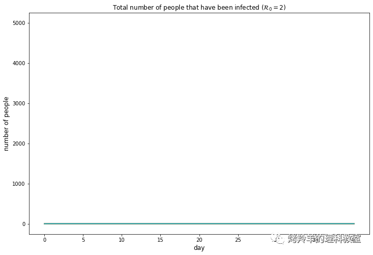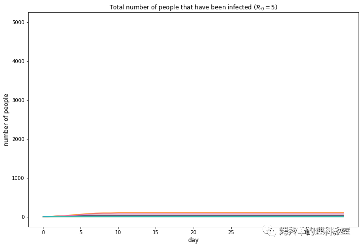 依然是在5000人的人口规模下,稍微给病毒留点扩散的机会,初始的传染性患者数量设为5个,也就是占比为总人口的0.1%。我们看看这5个病毒的火种有没有机会燎原。