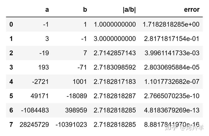 \[\begin{aligned} \bigg|\frac{a_2}{b_2}\bigg| &= \frac{19}{7} = 2.71429\cdots \\ \bigg|\frac{a_3}{b_3}\bigg| &= \frac{193}{71} = 2.71831\cdots \\ \end{aligned}\]跟 \(\mathrm{e}\approx 2.71828\) 的准确值比起来是不是已经有那么点意思了?