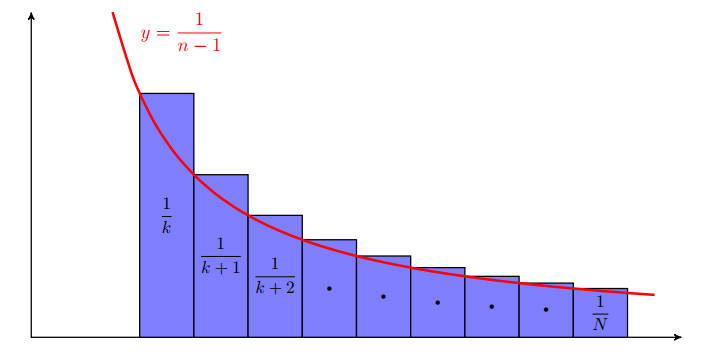 \[P(k) = \sum_{n=k+1}^N \left(\frac{1}{N} \times \frac{k}{n-1}\right) = \left(\sum_{n=k+1}^N \frac{1}{n-1}\right) \times \frac{k}{N}\]表达式里比较麻烦的是括号里对 \(\frac{1}{n-1}\) 的求和。我们把这个求和想象成底为单位长、高逐个减小的一系列矩形的总面积,如下图蓝色区域所示。这部分面积可以由函数 \(y=\frac{1}{n-1}\) 曲线下对应的面积来近似。当 \(N\) 足够大时,这个近似的误差会足够小。