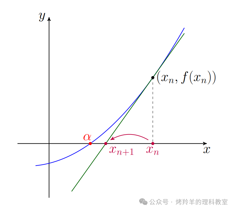 接下来我们在点 \((x_n, f(x_n))\) 处作函数 \(y=f(x)\) 的切线,注意到这条切线会与 \(x\) 轴相交于一个离精确解 \(\alpha\) 更近的点,自然地,我们将其取作一个更好的近似根,记作 \(x_{n+1}\)。如此不断地重复,我们就可以不断地逼近真正的精确解 \(\alpha\),直到我们满意的精度。