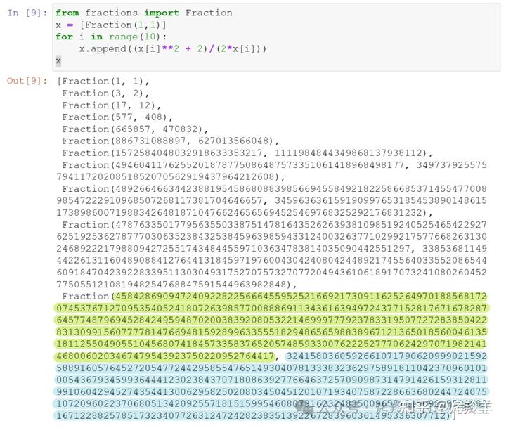 10次迭代得到的 \(\sqrt{2}\) 近似式已经是个分子和分母都是692位数的巨无霸分式。