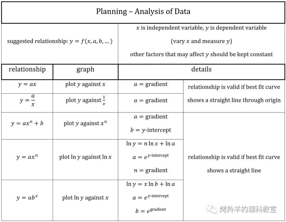 关系式中涉及到的一些待定参数、比例系数,也可以通过拟合直线的斜率(gradient)、截距(\(y\)-intercept)间接算出。注意问题的措辞一般是问该如何确定这些待定参数,所以答题只是写出斜率和/或截距的表达式是拿不到分的,一定要给出某某参数的表达式才行,当然这个表达式通常会是带有斜率和/或截距的半文字半符号的形式。