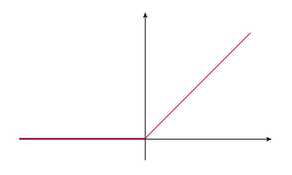 \[\text{ReLU}(z) = \text{max}(0,z) = \left\{\begin{array}{ll} z & \text{for } z \geq 0 \\ 0 & \text{for } z < 0 \end{array} \right.\]