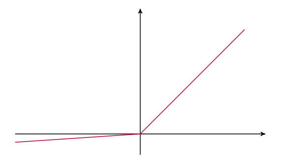 \[\text{leaky ReLU} = \text{max}(\beta,z) = \left\{\begin{array}{ll} z & \text{for } z \geq 0 \\ \beta z & \text{for } z < 0 \end{array} \right. \quad \text{where }\beta \ll 1\]