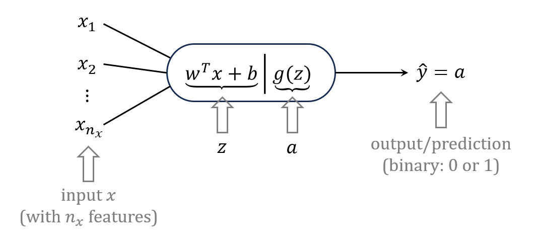 where \(\displaystyle \mathbf{x} = \begin{bmatrix} x_1 \\ x_2 \\ \vdots \\ x_{n_x} \end{bmatrix}, \mathbf{w} = \begin{bmatrix} w_1 \\ w_2 \\ \vdots \\ w_{n_x} \end{bmatrix}\) and \(z, b \in \mathbb{R}\).