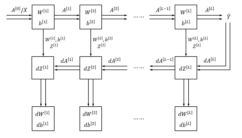 \[\begin{align*} dZ^{[l]} &= dA^{[l]} * g^{[l]'}(Z^{[l]}) \\ dW^{[l]} &= dZ^{[l]} A^{[l-1]T} \\ db^{[l]} &= \sum_{i=1}^m dZ^{[l](i)} \\ dA^{[l-1]} &= {W^{[l]}}^T dZ^{[l]} \end{align*}\]typical architecture of a deep neural network