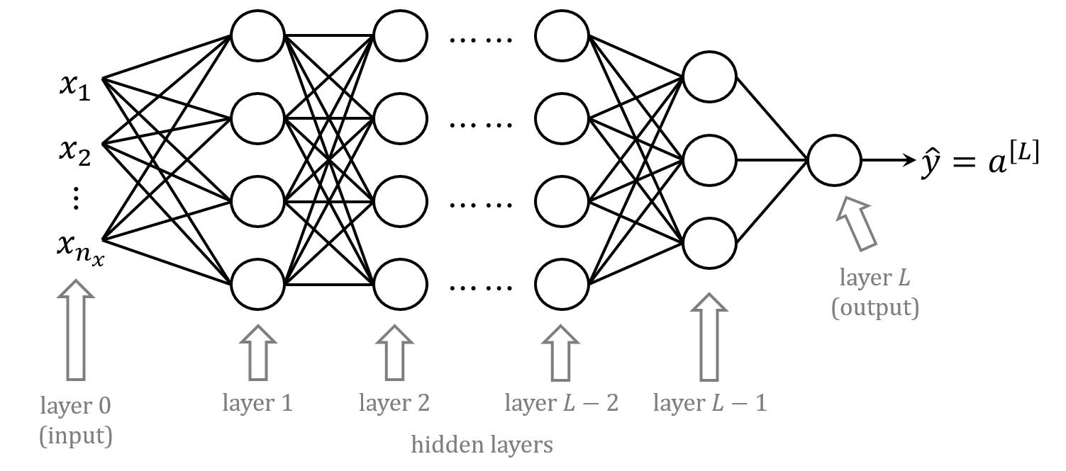 - \(A^{[L]} = \hat{Y} = \begin{bmatrix} \hat{y}^{(1)} & \hat{y}^{(2)} & \cdots & \hat{y}^{(m)}\end{bmatrix}\) is the predicted output