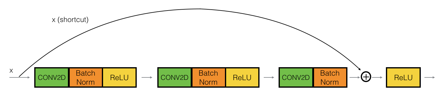 - Identity block: input activation has the same dimention as output activation
