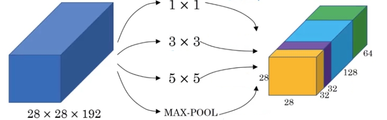 We can apply different convolutions and pooling with filters of multiple sizes at the same layer, and concatenate them to give an output volume.