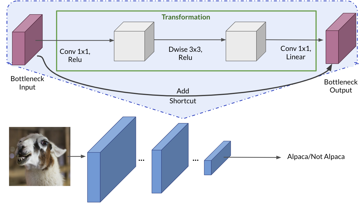 The diagram below shows the architecture of MobileNetV2, which takes advantage of depthwise separable convolutions together with shortcut connections to speed up training and improve predictions. This allows MobileNetV2 to be run on mobile or other low-power applications with good efficiency.