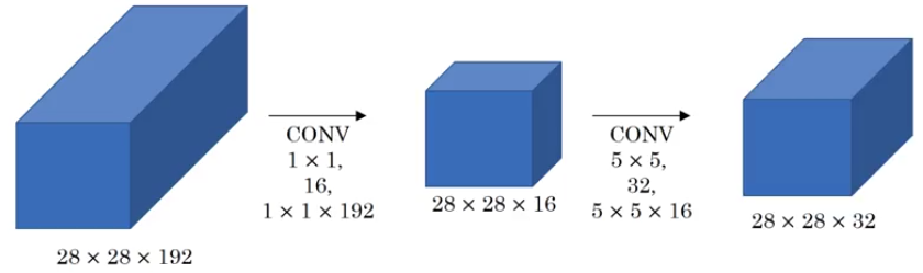 One problem with such inception block is its high computation cost. In order to save computations, we can shrink the number of channels by using \(1\times1\) convolution filters. The following example shows how the number of computations is greatly reduced by the bottleneck layer of \(1\times1\) convolutions.