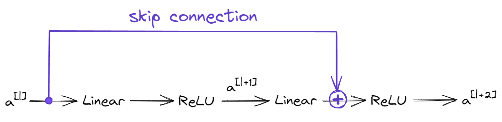 The diagram shows a skip connection being added between the \(l^\text{th}\) layer and the \((l+2)^\text{th}\) layer, which can be symbollically represented as: \(a^{[l+2]} = g\left( z^{[l+2]} + a^{[l]}\right)\)