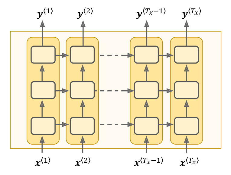 For learning very complex functions, it is useful to stack multiple layers of RNNs to build deeper versions of these models. For each time step, we can stack many hidden layers and build lateral connections between them. A deep RNN with three layers would look like this: