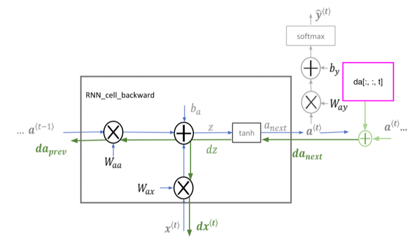 \[\begin{align*} d \mathbf{W}_{ax} &= \frac{\partial J}{\partial \mathbf{z}^{\langle t \rangle}} \frac{\partial \mathbf{z}^{\langle t \rangle}}{\partial \mathbf{W}_{ax}} = d \tanh \cdot {\mathbf{x}^{\langle t \rangle}}^T \\ d\mathbf{W}_{aa} &= \frac{\partial J}{\partial \mathbf{z}^{\langle t \rangle}} \frac{\partial \mathbf{z}^{\langle t \rangle}}{\partial \mathbf{W}_{aa}} = d\tanh \cdot {\mathbf{a}^{\langle t-1 \rangle}}^T \\ d\mathbf{b}_a & = \frac{\partial J}{\partial \mathbf{u}^{\langle t \rangle}} \frac{\partial \mathbf{z}^{\langle t \rangle}}{\partial \mathbf{b}_{a}} = \sum_\text{batch}d\tanh \\ d\mathbf{x}^{\langle t \rangle} &= \frac{\partial J}{\partial \mathbf{z}^{\langle t \rangle}} \frac{\partial \mathbf{z}^{\langle t \rangle}}{\partial \mathbf{x}^{\langle t \rangle}} = {\mathbf{W}_{ax}}^T \cdot d\tanh \\ d\mathbf{a}^{\langle t-1 \rangle} &= \frac{\partial J}{\partial \mathbf{z}^{\langle t \rangle}} \frac{\partial \mathbf{z}^{\langle t \rangle}}{\partial \mathbf{a}^{\langle t-1 \rangle}} = { \mathbf{W}_{aa}}^T \cdot d\tanh \end{align*}\]We may check that these parameter gradients make sense by checking the dimensions of the vectors and tensors that appear on both sides: