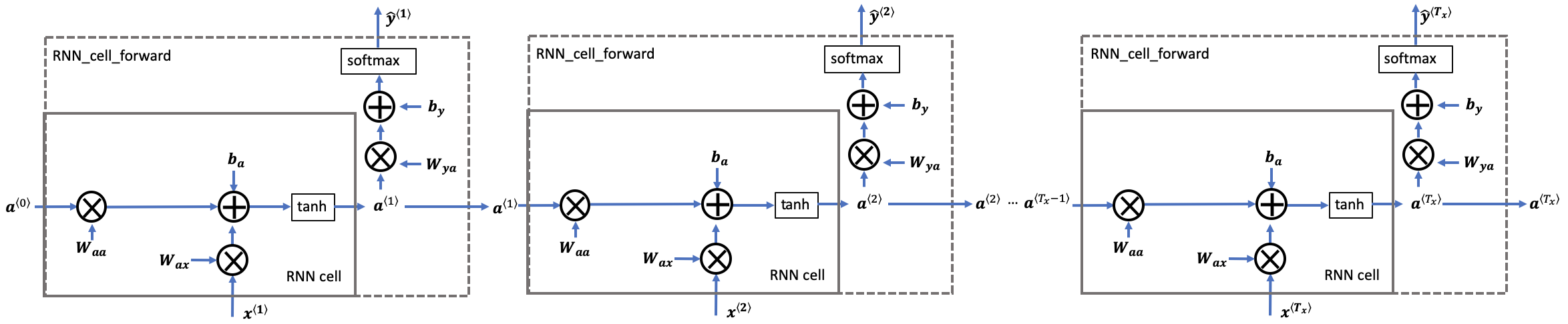 \[\mathbf{a}^{\langle t \rangle} = \tanh(\mathbf{W}_{aa} \mathbf{a}^{\langle t-1 \rangle} + \mathbf{W}_{ax} \mathbf{x}^{\langle t \rangle} + \mathbf{b}_a) \\ \hat{\mathbf{y}}^{\langle t \rangle} = \text{softmax}(\mathbf{W}_{ya} \mathbf{a}^{\langle t \rangle} + \mathbf{b}_y)\]Note that the hyperbolic \(\tanh\) is chosen as the activation function so that \(\mathbf{a}^{\langle t \rangle}\) is always a tensor containing values within the range \((-1, 1)\).