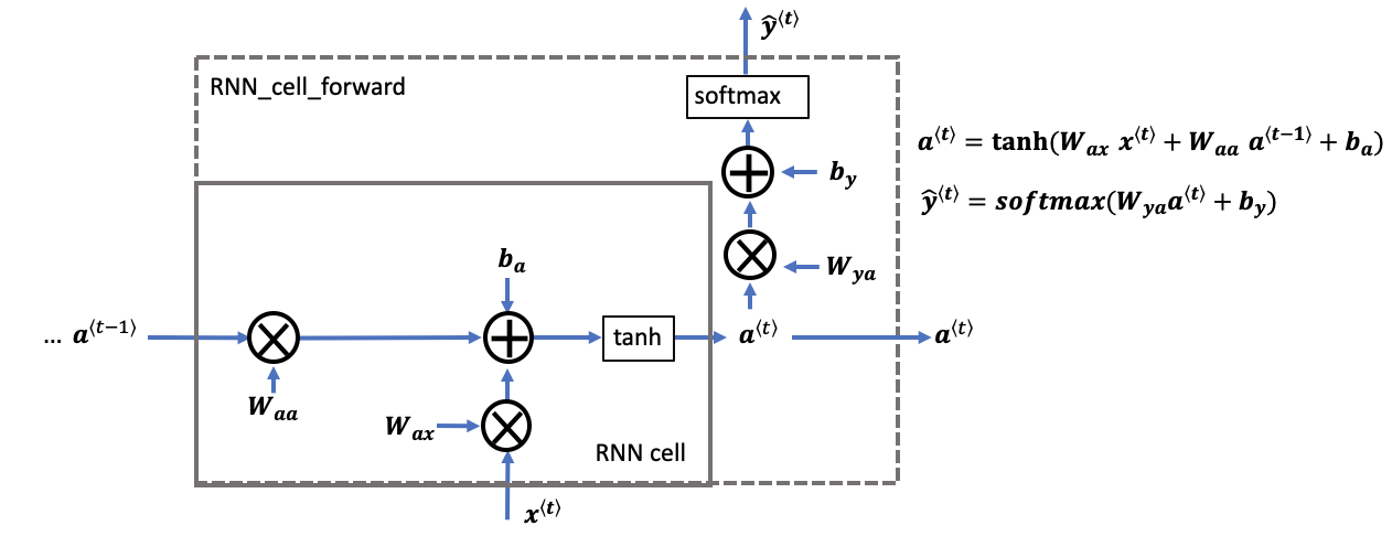 \[\mathbf{z}^{\langle t \rangle} = \mathbf{W}_{ax} \mathbf{x}^{\langle t \rangle} + \mathbf{W}_{aa} \mathbf{a}^{\langle t-1 \rangle} + \mathbf{b}_{a}\]We can then write the output of the basic cell as: