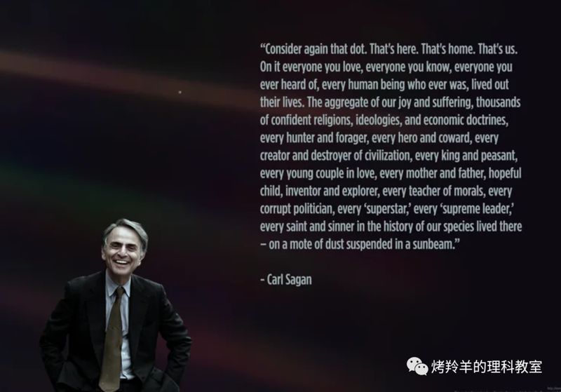 再来看一眼这个小点。就在这里。这就是家。这就是我们。在这个小点上,每一个你爱的人,每一个你认识的人,每一个你听说过的人,每一个人,无论是谁,都在此度过一生。我们所有的快乐和挣扎,数以千万自傲的宗教信仰、思想体系观念意识,以及经济学原理教义,每一个猎人或征服者,每一位勇士或懦夫,每一个文明的缔造者或摧毁者,每一位君王或农夫,每一对陷入爱河的年轻伴侣,每一位为人父母者,所有充满希望的小孩、发明家或探险者,每一位灵魂导师,每一个腐败的政客,每一个所谓的‘超级巨星’,每一个所谓的‘至高领袖’,每一位我们人类史上的圣人或罪人……我们的一切一切,全部都存在于这样一粒悬浮在一束阳光中的尘埃上。
