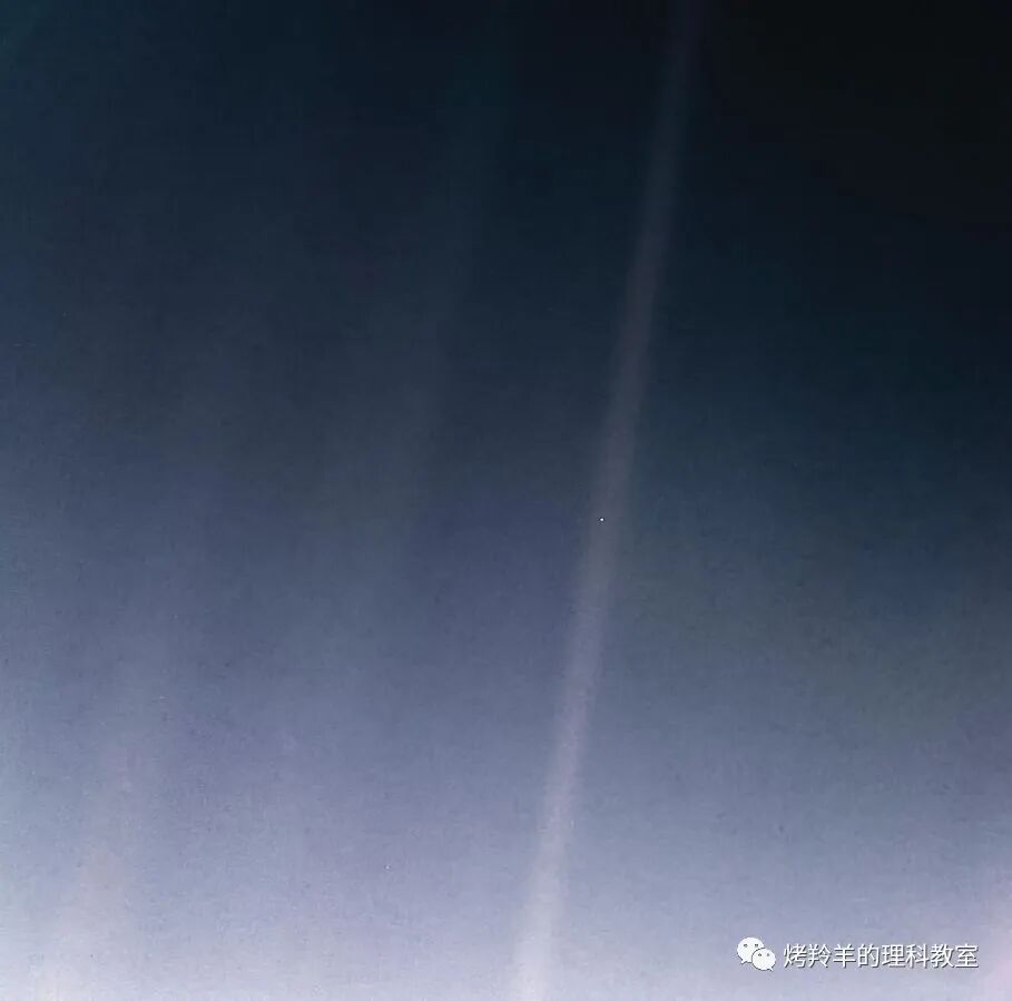 当然少不了 Carl Sagan 最富有诗意的这段话。NASA 于1977年5月发射的旅行者一号(Voyager 1)飞船在成功完成了对木星、土星的观测任务后,于1990年2月飞抵了海王星轨道。在掠过海王星轨道之际,飞船调转了摄像镜头的方向,在继续重新迈向远离太阳系的旅途之前,在距离地球60亿公里之处,向我们的家园投来了最后一瞥,留下了一组著名的照片。在照片中,我们所生存的地球,看起来不过是星辰大海中一个毫不起眼的暗淡蓝点(Pale Blue Dot),Carl Sagan 也由此写下了一段富有诗意的话: