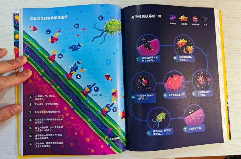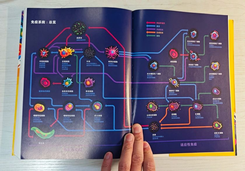这本《战斗细胞》的书内插画和作者 Youtube 频道的科普视频师出同门,高饱和卡通系的萌兮兮风格,配合不失专业性的文字,形象地展现了免疫系统的运作方式。