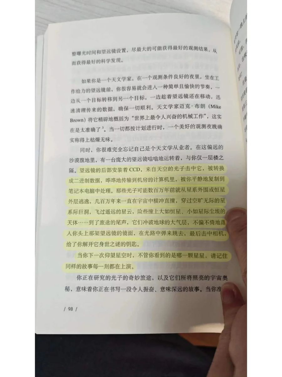 每个人的儿时大约都曾有过追逐群星的梦想,而书中写到的观星人们(Stargazers,真是个很美丽的名字)把心中的热火转化成了毕生的事业。作者对于探索星空奥秘的熊熊热情,渗透在全书的字里行间。我非常喜欢整本书结尾所写的: