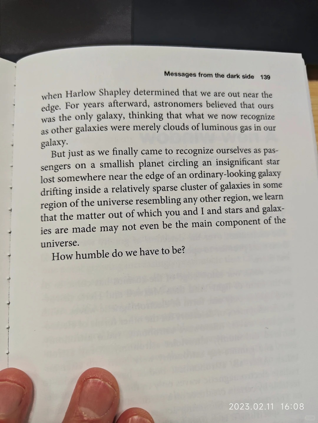 “当意识到我们不过是在苍茫宇宙中与其他地方别无二致的某个区域的某个稀疏星系团里漂浮着的某个普普通通的星系的边缘地带的一颗毫不起眼的恒星的边上绕着转的一颗小小的行星上的匆匆过客, 甚至组成你、我、恒星、星系的物质都远远称不上是构成宇宙的主要成分,身为人类,再谦卑也不为过。”