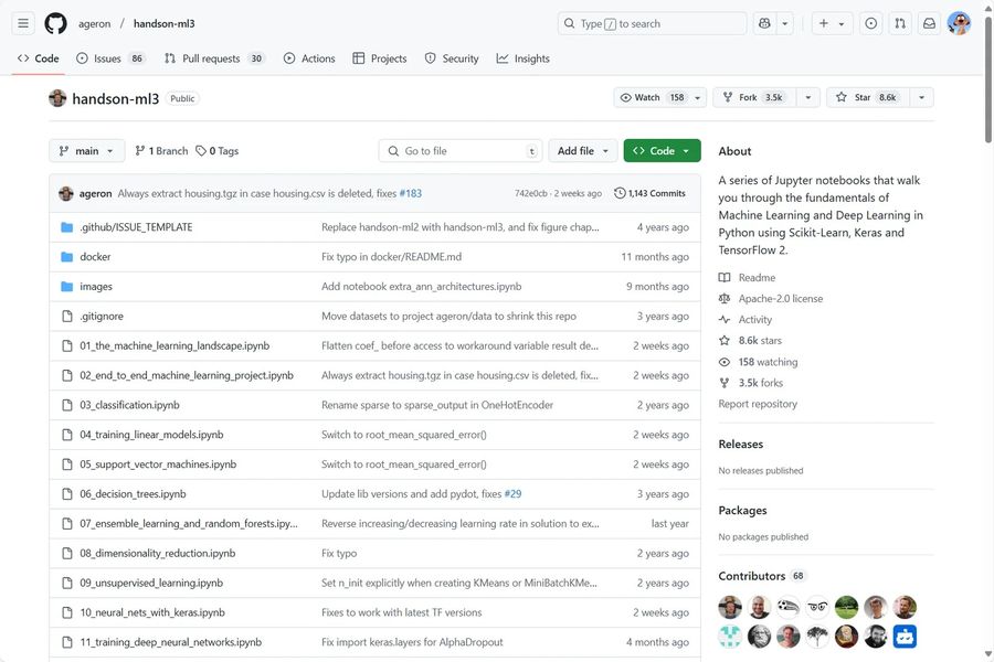 此外,Aurélien Géron 非常业界良心地在 GitHub 上放出了和蜥蜴书每个章节对应的全套 Jupyter Notebooks,即便只是下载这堆 Notebooks 一路无脑运行一遍,也能学到不少东西,配合大佬的书当然是服用效果更佳。